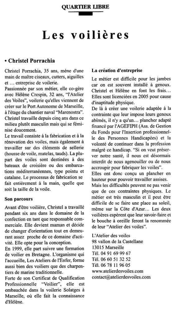 Cristel Poracchia, 35 ans, mène d'une main de maître ciseaux, cutters, aiguilles et ... entreprise de voilerie. Passionnée par son métier, elle co-gère avec Hélène Crespin, 32 ans, "l'Atelier des Voiles", voilerie qu'elles viennent de créer sur le Port Autonome de Marseille, à l'étage du chantier naval "Marenostra". Cristel travaille depuis cinq ans dans ce milieu plutôt masculin mais qui se féminise doucement. Le travail consiste à la fabrication et à la rénovation des voiles, mais également à travailler sur des éléments de sellerie (housse de voile, matelas, tauds). La plupart des voiles sont destinées à des bateaux de croisière ou des embarcations méditerranéennes, type pointu et catalane. Le processus de fabrication se fait entièrement à la main, quelle que soit la taille de la voile.